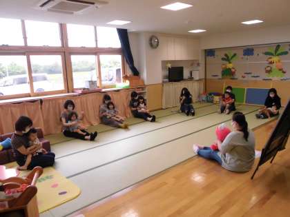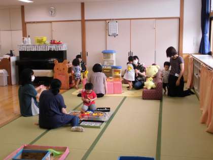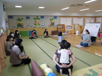 7月8日合同親子サークル 公開日 2020/07/08 更新日 2020/07/08 子育て支援 今日は、7月2回目の合同親子サークルでした。参加者は少なかったのですが、和気あいあいとした雰囲気の中で思い思いの遊びを親子で楽しんでいました。そして、ノンタンに自分の名前を呼んでもらったり、「あたま、かた、ひざ、ぽん」の手遊びや「バスに乗って揺られてる」の歌遊びなどをママと一緒に楽しみました。