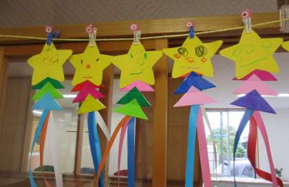 星の製作は七夕飾りです。好きな色の折り紙で三角をつくり、重ねて貼り合わせました。角と角をきちんと合わせることや、折り曲げた個所をしっかり折ることを知らせるとみんな真剣な表情でつくっていました。きっとお星さまに届けたいお願いがあるんですね!
