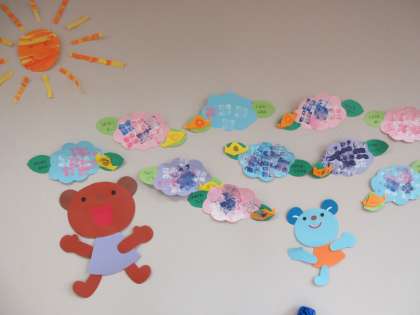 またあじさいの壁面製作もしました。スポンジであじさいの花の形をつくり、スタンプをしましたよ。スタンプは子供たちの大好きな製作です。子供たちも楽しみながらきれいなあじさいをつくっていました。