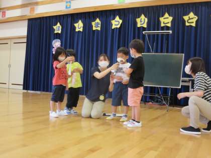 星まつり子ども会がありました。みんなで集まって「たなばたさま」の歌を歌ったりブラックパネルシアターで織姫と彦星のお話を聞いたりしました。3、4、5歳のお友達にお願い事を発表してもらいました。「大きくなったら看護師になりたいな」「ポケモンに会えますように」「これからも元気いっぱい遊べますように」みんなのお願いが叶うといいですね。