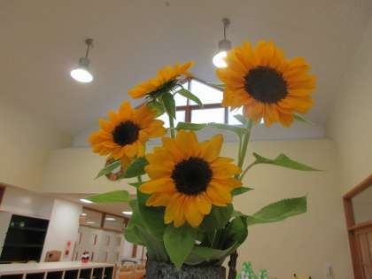 地域の方から「こども園に飾ってください」ときれいに咲いたヒマワリをたくさんいただきました。