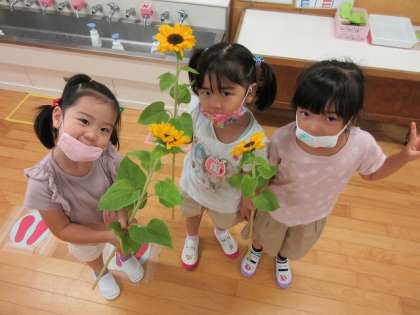 ビタミンカラーの黄色いヒマワリを見ていると、梅雨のうっとおしさも吹き飛ぶようです。各保育室に配ると「すごい!」「きれい!」とみんな歓声を上げて集まってきました。特に年中さんは同じヒマワリを育てているので「早くこども園のヒマワリも咲いてほしい〜!」と言っていましたよ。
