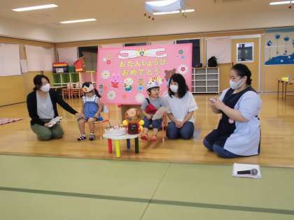 今日は、1学期最後の2歳児サークルで、4月・5月・6月・7月生まれのお誕生会をしました。お友達にハッピーバースデイの歌を歌ってもらって、とても嬉しそうな誕生児さんでした。