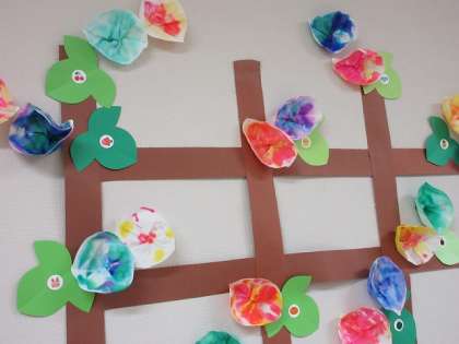 1歳児りんご組・2歳児みかん組も壁面製作を行いました。