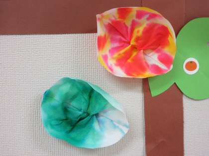 みかん組は障子紙にマーカーで色をに塗って霧吹きでシュッ。きれいににじんだ紙は本物の朝顔のように見えます。クレヨンを使うことが多いみかん組ですが、いつもと違う絵の描き方をすると、より絵を描くことに興味がもてます。こうした経験を積み重ねて、子供たちは製作遊びの楽しさを感じていきます。
