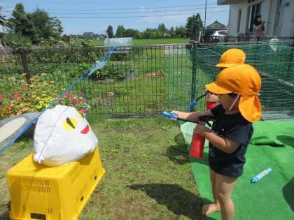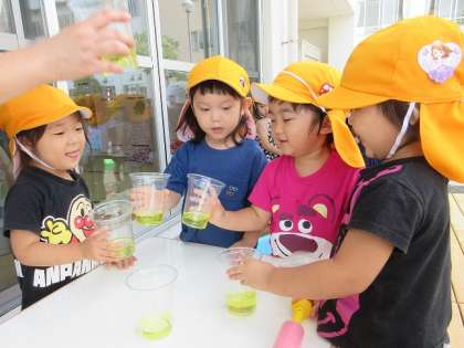 暑い日が続き、たくさん水遊びを楽しんでいるみかん組。水鉄砲でおばけをやっつけたり、魚釣りをしたり、元気いっぱい遊んでいます!今日は色水を使ってジュース屋さんごっこをしました。「ジュースくださーい」と買いに行く子や、友達と「かんぱーい」とコップを合わせる子など、自由にのびのびと遊びました!