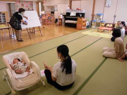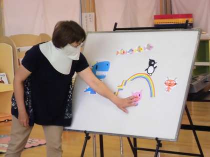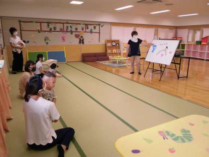 9月16日いちごクラブ 公開日 2020/09/16 更新日 2020/09/16 子育て支援 今日の親子サークルは、吉野絵美先生を講師にお招きして「パネルシアター劇場」を楽しみました。「おかしなはなし」「トコトコぼうし」「ふわりくも」「へんてこもぐもぐかいじゅう」の4つのお話を見せていただきました。1歳児の小さなお友達でしたが、どの子も先生の話術とお話の面白さに引き込まれて、最後まで真剣に見入っていました。きっとお話の好きな子ばかりだったのでしょうね。吉野先生も感心しておられましたよ!