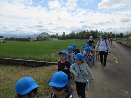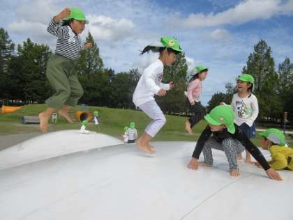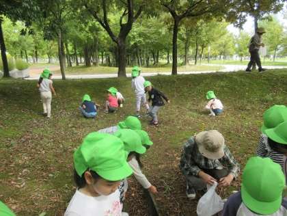 今日は県総合運動公園に行って、ふわふわドームで遊んだり、秋の自然を探したりしました。公園まで歩くのもへっちゃら、運動会を終え、またたくましくなった年長組です。