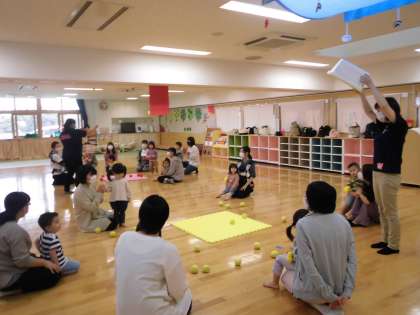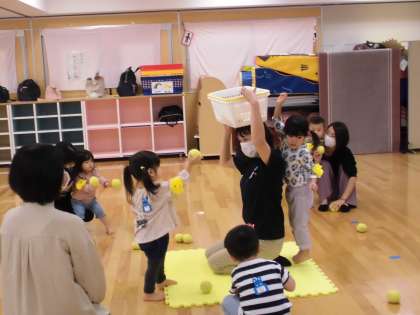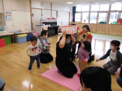 10月13日(火)合同サークル・その2 公開日 2020/10/13 更新日 2020/10/13 子育て支援 一番盛り上がったのは玉入れです。力いっぱい球を投げたりママに抱っこしてもらって球を入れたりして楽しみました。結果は、1対1の同点でした!