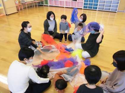10月21日(水)いちごクラブ・その1 公開日 2020/10/21 更新日 2020/10/21 子育て支援 今日のいちごクラブに5組のお友達が遊びに来てくれました。そして、塩原先生においでいただき、親子で楽しめる触れ合いリトミック遊びをたくさん教えていただきました。
