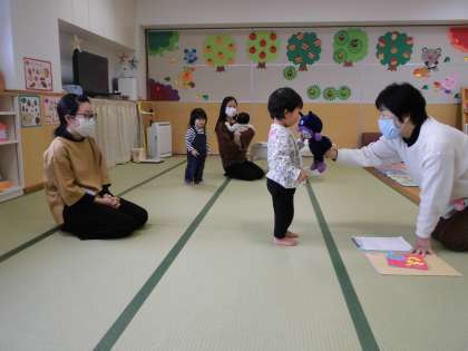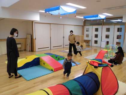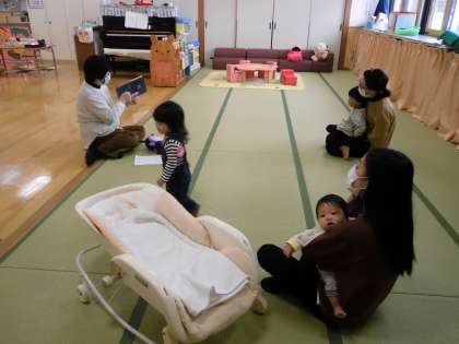 今日は3組のお友達が集まり、ゆったりとした時間の中でママと一緒に好きな遊びを楽しみました。たっぷり遊んだためか、遊んだ後のオモチャの片付けがとてもスムーズにできました。集まりの会では、自分の名前を呼ばれると「はーい」とかわいい声で返事ができました。そして「くるっ」の絵本や「ふしぎなくるま」の紙芝居を見たり、「やきいもグーチーパー」のじゃんけんをママと一緒にしたりして遊びました。面白かったね! さて、来週は、富山健康パークで合同サークルを行います。たくさん集まってね!