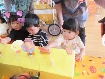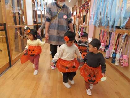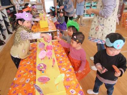 りんご組の子供たちはお化けカボチャの衣装やネコ耳を付けて大きい組さんのお店屋さんに行ってきました。「どれにしようかな」とかわいいバックやキャンディを選んでいました。お兄さんお姉さんからもらったおみやげはとても大事そうに持ち帰りましたよ!