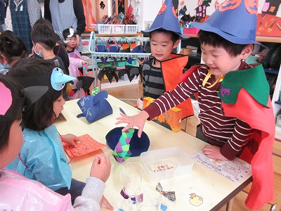 お店屋さんの子供たちは「いらっしやいませ」「黒猫のカバンはどうですか」「ステッキは、キラキラがついていますよ」などと、声をかける姿が見られました。お店さんになりきって遊ぶことを楽しみました。