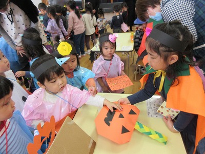 年中組の子供たちはカバンやステッキ、キーホルダー、帽子などをつくって「みんなわくわくハロウィンショップ」を開店しました。ハロウィンのカボチャや黒猫、お化けなどの絵を描いたり、画用紙で形を切り抜いたりして品物をつくりました。