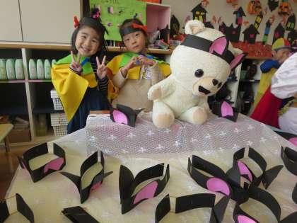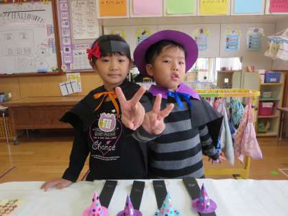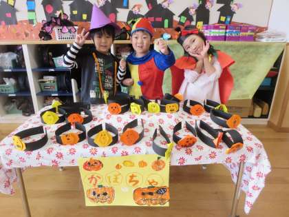 ハロウィンパーティー楽しかったね(年中パート3) 公開日 2020/10/30 更新日 2020/10/30 年中もも・すみれ組 かわいい衣装を身に着けて「いらっしゃいませ」「これはどうですか」と呼び込みをし、張り切ってお店屋さんを楽しんでいました。売っている商品をお客さんに買ってもらえることを喜ぶ姿も見られました。