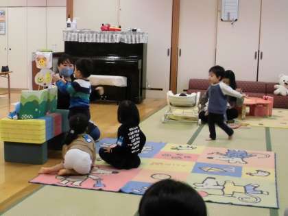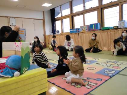 今日は、富山健康パーク内での活動を予定していましたが、都合でなかよしルームでの活動に変更となりました。雨降りで寒い日だったのですが、2歳児5組、1歳児3組、計8組のお友達が集まって楽しく遊びました。