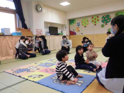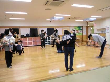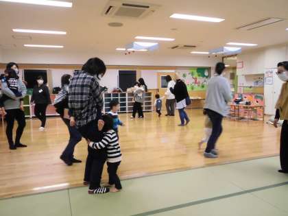 11月4日(水)合同サークル・その2 公開日 2020/11/06 更新日 2020/11/06 子育て支援 保育士と「こぶた・たぬき・きつね・ねこ」の手遊びや「おおかみさん」のCDに合わせて追いかけっこをして遊びました。2歳児は、先週に続いて2回目の追いかけっこだったので、「おおかみなんて怖くない!」と元気に歌って走っていました。1歳児は初めての追いかけっこだったので、ちょっと怖かった子もいたようですが、2歳児に負けじと逃げ回っていました。今度またやってみようね!