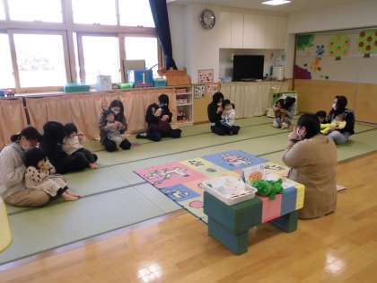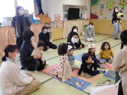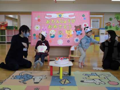 11月10日(火)メロンクラブ:その1 公開日 2020/11/11 更新日 2020/11/11 子育て支援 今日は、7組のお友達が集まって10月生まれと11月生まれのお友達の誕生会をしました。誕生児も友達に「おめでとう」と言われて、とてもうれしそうでした。お祝いに大型絵本を読んでもらったのですが、最後まで真剣に話を聞くことができ、6月からの子供たちの成長を感じることができました。