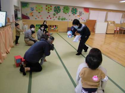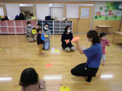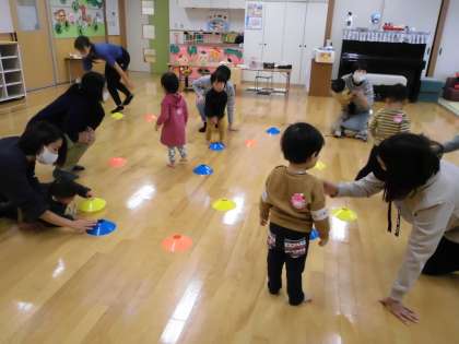 11月11日(水)いちごクラブ:その1 公開日 2020/11/11 更新日 2020/11/11 子育て支援 小雨の降る肌寒い天気でしたが、今日は6組のお友達が遊びに来てくれました。出席を取った後、講師に石川先生をお招きして「親子体操教室」をしました。初めはミニコーンの間をハイハイしたり、穴の中に指を入れて回したりする遊びを楽しみました。
