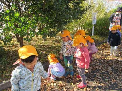 秋の散歩に行ってきました。「赤色だ」「きれいだね」と歩きながら紅葉したもみじや色づいたいろいろな葉を見てきました。足元にはたくさんの落ち葉があり「わー、いっぱいあるね」とカサカサ音を立てながら歩くことを楽しみました。落ち葉を集めてふわっと空にまくと「きゃー」と嬉しそうな子供たちでした。落ち葉の中にドングリも見つけて拾い、大事にお土産に持って帰りましたよ。