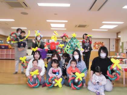 今日の親子サークルはバルーンアートをして楽しみました。細長いバルーンがサンタクロースやクリスマスツリーの形になり、子ども達もお家の方も喜んでいました。最後には弓矢のバルーンや剣のバルーンも出てきて、とても楽しい一時となりました。